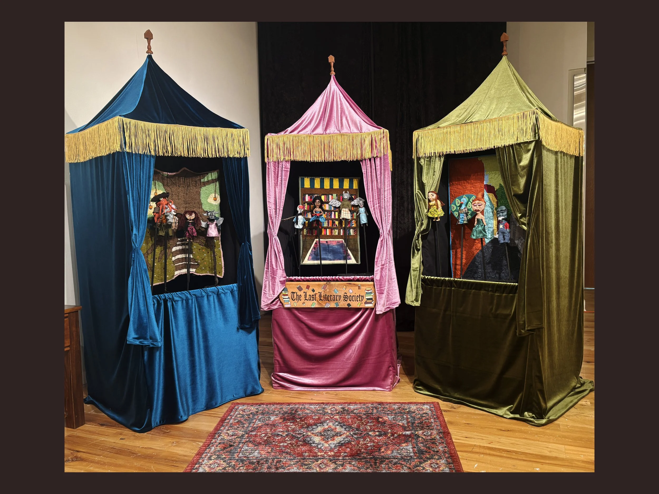 This village of puppets falls on three backdrops: a quaint village road, a fantastical forest home, and a comforting library. These villagers reside in a world where only one library exists, stranded on a secluded island between two lands. This library hidden in a cottage contains every book, film, and audio ever recorded. It is here that these characters find each other and connect through the last literary society.